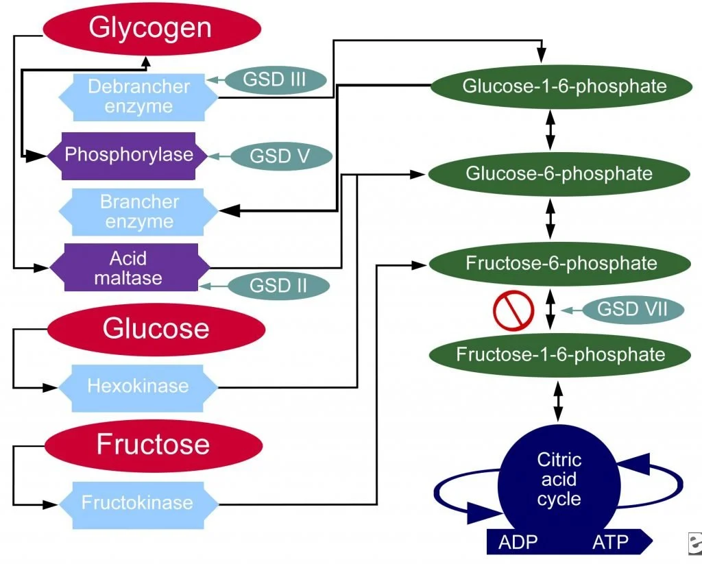 Remember that another name for Pompe Disease is Glycogen Storage Disease Type 2, which is abbreviated in the above graphic as GSD II. GSD II does not affect glucose metabolism, fructose metabolism, or the other pathways involved with glycogen metabolism. Since all other glycogen/glucose/fructose metabolism pathways work in Pompe Disease, PWF started asking our medical team a few questions.